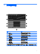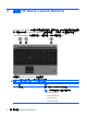 1 使用指標裝置 組件 說明 (1) 指標桿* 移動指標,並選擇或啟動螢幕上的項目。 (2) 左指標桿按鈕* 功能類似外接式滑鼠的左鍵。 (3) 觸控板* 移動指標,並選擇或啟動螢幕上的項目。 (4) 左觸控板按鈕* 功能類似外接式滑鼠的左鍵。 (5) 中央觸控板按鈕* 功能類似外接式滑鼠的中間鍵。 (6) 右觸控板按鈕* 功能類似外接式滑鼠的右鍵。 (7) 觸控板捲軸區 向上或向下捲動。 (8) 右指標桿按鈕* 功能類似外接式滑鼠的右鍵。 (9) 中央指標桿按鈕* 功能類似外接式滑鼠的中間鍵。 * 本表格說明出廠設定。若要檢視或變更指標裝置喜好設定,請選擇「開始」>「控制台」>「印表機和其他硬體」>「滑鼠」。 1