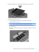 11. Plaats het afdekplaatje van het geheugenmodulecompartiment met de lipjes (1) in de uitsparingen in de computer. 12. Sluit het afdekplaatje (2). 13. Draai de schroef van het afdekplaatje van het geheugenmodulecompartiment vast (3). 14. Plaats de accu terug. 15. Draai de ondersteboven liggende computer weer om, en sluit vervolgens de externe voedingsbron en de randapparatuur weer aan. 16. Zet de computer aan.