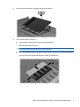 13. Kiristä muistimoduulipaikan kannen ruuvi (3). 14. Aseta akku paikalleen. 15. Käännä tietokone ylösalaisin ja liitä ulkoinen virtalähde ja ulkoiset laitteet. 16. Käynnistä tietokone. Päämuistimoduulipaikassa olevan muistimoduulin päivittäminen Päivitä päämuistimoduulipaikassa oleva muistimoduuli seuraavasti: 1. Tallenna työtiedostot. 2. Sammuta tietokone. Jos et ole varma, onko tietokoneen virta katkaistu vai onko tietokone lepotilassa, käynnistä tietokone painamalla virtapainiketta.