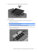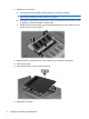 13. Dokręć śrubę pokrywy komory modułu pamięci (3). 14. Włóż baterię na miejsce. 15. Obróć komputer prawą stroną do góry a następnie podłącz zewnętrzne zasilanie i urządzenia zewnętrzne. 16. Włącz komputer. Dodawanie modułu pamięci do podstawowego gniazda modułu pamięci Aby dodać moduł pamięci do podstawowego gniazda modułu pamięci, wykonaj następujące kroki: 1. Zapisz swoją pracę. 2. Wyłącz komputer.