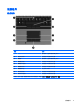 顶部组件 指点设备 组件 说明 (1) 指点杆* 移动指针,选择或激活屏幕上的项。 (2) 指点杆左按钮* 功能类似于外接鼠标的左键。 (3) 触摸板* 移动指针,选择或激活屏幕上的项。 (4) 触摸板左按钮* 功能类似于外接鼠标的左键。 (5) 触摸板中间按钮* 功能类似于外接鼠标的中键。 (6) 触摸板右按钮* 功能类似于外接鼠标的右键。 (7) 触摸板滚动区 向上或向下滚动。 (8) 指点杆右按钮* 功能类似于外接鼠标的右键。 (9) 指点杆中间按钮* 功能类似于外接鼠标的中键。 *此表介绍出厂设置。要查看或更改指点设备首选项,请选择开始 > 控制面板 > 硬件和声音 > 鼠标。 顶部组件 3