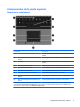 Componentes de la parte frontal Componente Descripción (1) Encendido: Un dispositivo inalámbrico integrado, como un dispositivo de red de área local inalámbrica (WLAN) y/o un dispositivo Bluetooth, está encendido. Indicador luminoso de conexiones inalámbricas Ámbar: Todos los dispositivos inalámbricos están apagados. (2) (3) (4) Indicador luminoso de alimentación Indicador luminoso de la batería Indicador luminoso de la unidad ● Encendido: El equipo está encendido.