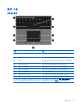 앞면 구성 구성 (1) 설명 무선 표시등 켜짐: WLAN(무선 근거리 통신망) 장치 및/또는 Bluetooth 장치와 같은 내장 무선 장치가 켜져 있습니다. 황색: 모든 무선 장치가 꺼져 있습니다. (2) (3) (4) 전원 표시등 배터리 표시등 드라이브 표시등 ● 켜짐: 컴퓨터가 켜져 있습니다. ● 깜박임: 컴퓨터가 절전 모드 상태입니다. ● 꺼짐: 컴퓨터가 꺼져 있거나 최대 절전 모드 상태입니다. ● 황색: 배터리를 충전하는 중입니다. ● 청록색: 배터리가 완전 충전량에 가깝습니다. ● 황색 깜박임: 유일하게 사용할 수 있는 전원인 배터리의 전원 이 부족한 상태에 도달했습니다. 배터리 충전량이 위험 상태 에 도달하면 배터리 표시등이 빠르게 깜박입니다. ● 꺼짐: 컴퓨터가 외부 전원에 연결된 경우 컴퓨터의 모든 배터 리가 완전히 충전되어 있으면 표시등이 꺼져 있습니다.