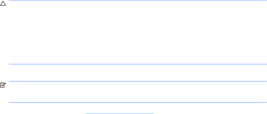 주의: 컴퓨터 손상 또는 잘못된 설치를 방지하려면 컴퓨터가 AC 어댑터를 사용하여 믿을 만한 외부