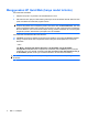 Kata sandi penyalaan Kata sandi penyalaan mencegah penggunaan komputer secara ilegal. Setelah kata sandi ini diset, kata sandi harus dimasukkan tiap kali Anda menghidupkan atau menginisiasi ulang komputer, atau keluar dari mode Hibernasi. Kata sandi penyalaan tidak akan ditampilkan saat diset, dimasukkan, diubah, atau dihapus. Mengelola kata sandi penyalaan Untuk mengeset, mengubah, atau menghapus kata sandi ini, ikuti langkah-langkah berikut: 1.