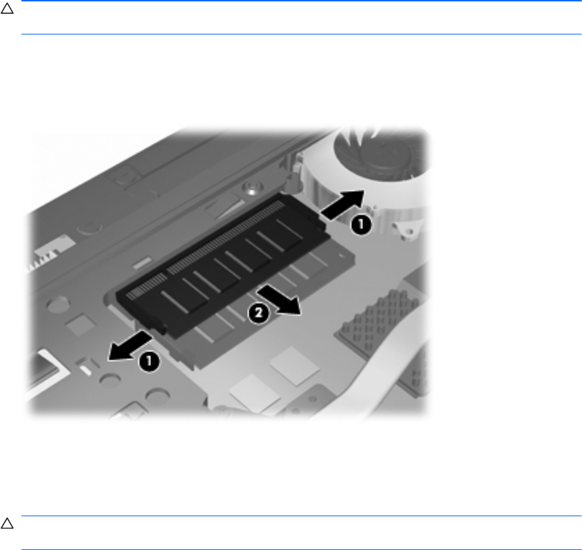 b. Uhvatite ivicu memorijskog modula (2) i pažljivo ga izvucite iz utora memorijskog modula.