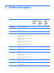 Category Description Compaq 325 model, UMA graphics, RS880M chipset Compaq 326 model, Discrete graphics, RS880MD chipset HP 425/625 models, UMA graphics, RS880M chipset Integrated wireless personal area network (WPAN) options by way of Bluetooth® module: External media cards Ports Keyboard/pointing devices Power requirements Support option for no-WPAN √ √ √ Bluetooth 2.