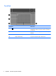 TouchPad Komponent 4 Beskrivelse (1) Indikator for TouchPad slukket Tænder og slukker TouchPad. Dobbelttap hurtigt på indikatoren for slukket TouchPad for at tænde og slukke for TouchPad'en. (2) TouchPad-zone Flytter markøren samt vælger og aktiverer elementer på skærmen. (3) Venstre TouchPad-knap Fungerer som venstre knap på en ekstern mus. (4) Højre TouchPad-knap Fungerer som højre knap på en ekstern mus.
