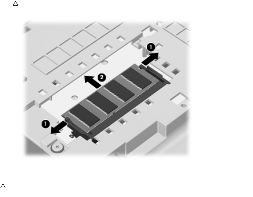 b. Grasp the edge of the memory module (2), and then gently pull the memory module out of