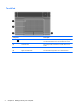 TouchPad Component 4 Description (1) TouchPad off indicator Turns the TouchPad on and off. Quickly double-tap the TouchPad off indicator to turn the TouchPad on and off. (2) TouchPad zone Moves the pointer and selects or activates items on the screen. (3) Left TouchPad button Functions like the left button on an external mouse. (4) Right TouchPad button Functions like the right button on an external mouse.