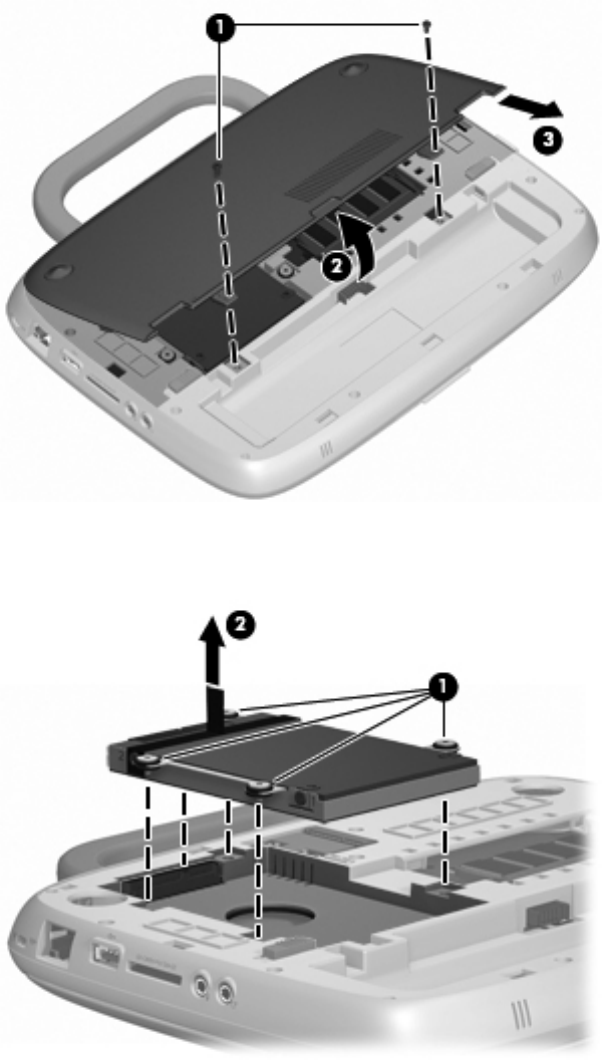 8. Grasp the tab (2), and lift the hard drive out of the hard drive bay.