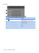 TouchPad Componente 4 Descrizione (1) Indicatore di disattivazione del TouchPad Consente di attivare e disattivare il TouchPad. Toccarlo rapidamente con due colpetti leggeri per accendere e spegnere il TouchPad. (2) Area del TouchPad Consente di spostare il puntatore e di selezionare e attivare gli elementi sullo schermo. (3) Pulsante sinistro del TouchPad Ha la stessa funzione del pulsante sinistro di un mouse esterno.