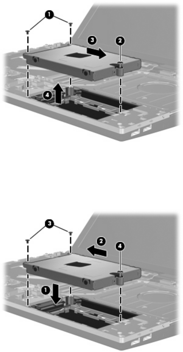 3. Sæt de to harddiskskruer på igen (3), og fastspænd fastgøreslsesskruen (4), så harddisken sidder
