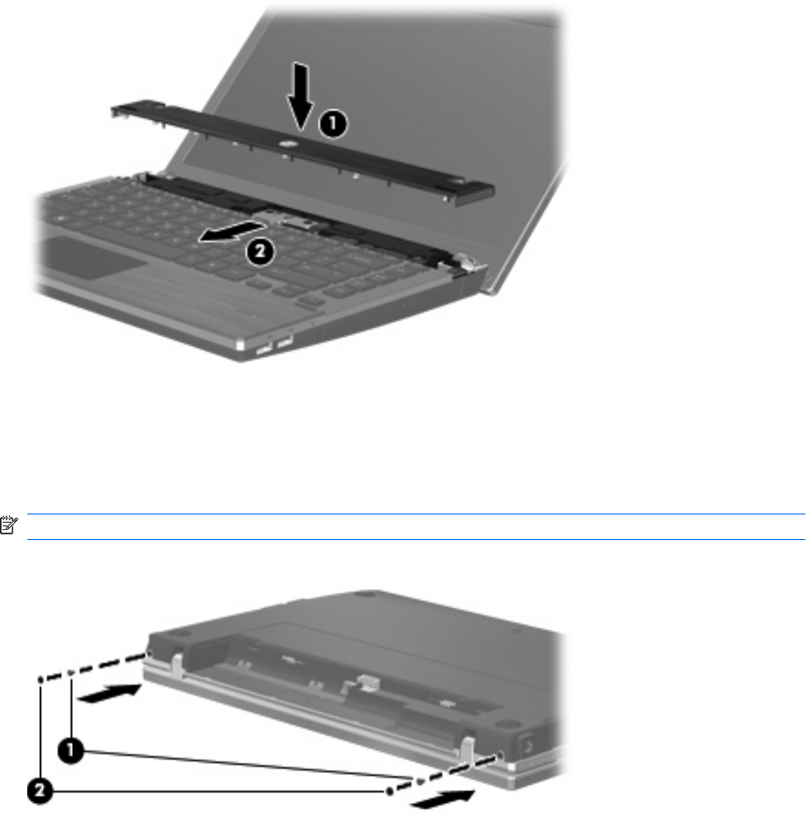20. Udskift de to skruer (1) og deres dæksler (2) på computerens bagkant.