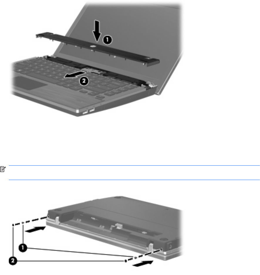 20. Plaats de 2 schroeven (1) en hun afdekplaatjes (2) terug op de achterkant van de computer.