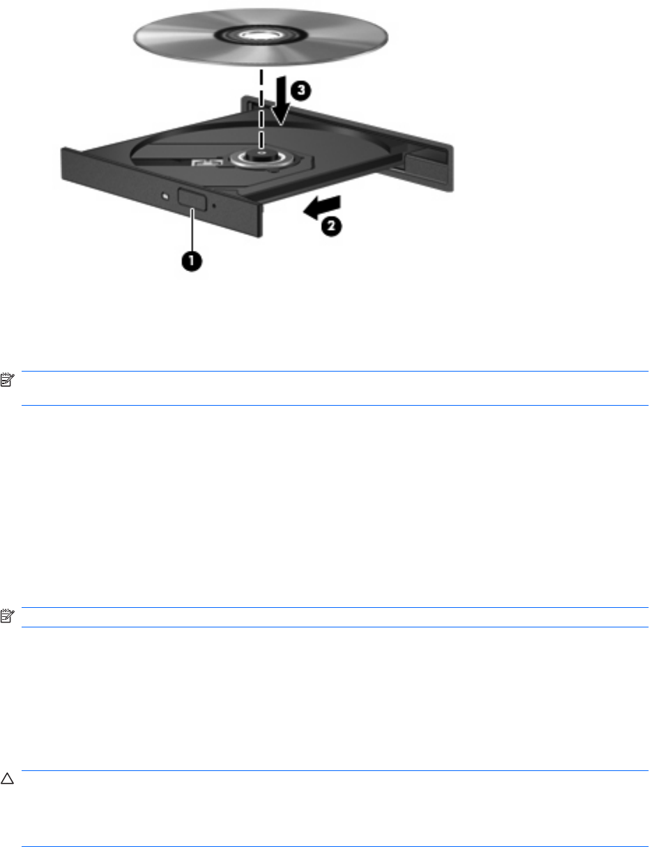 5. Druk de schijf voorzichtig op de as van de lade totdat de schijf vastklikt (3).