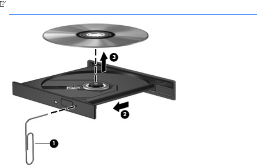 3. Verwijder de schijf (3) uit de lade door voorzichtig op de as te drukken terwijl u de schijf aan de