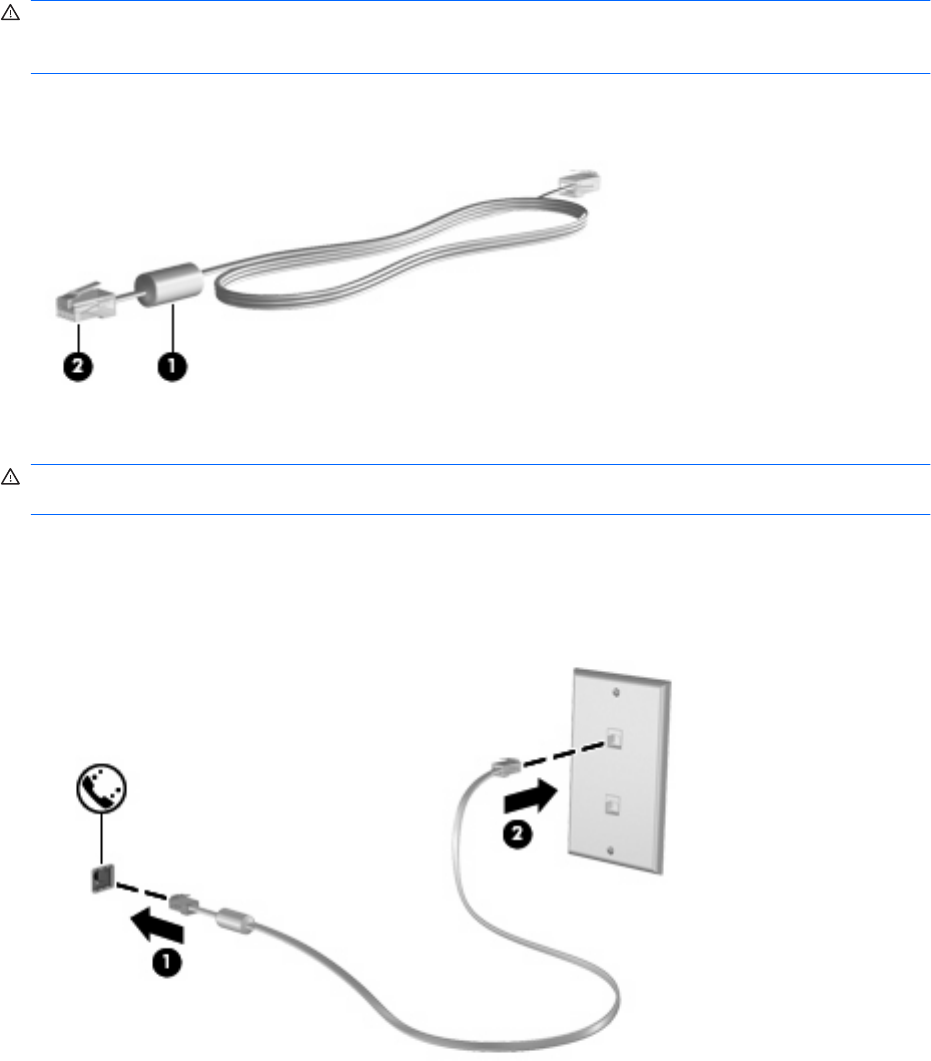 2. モデム ケーブルのもう一方の端を電話回線用モジュラー コンセントに接続します(2)。
