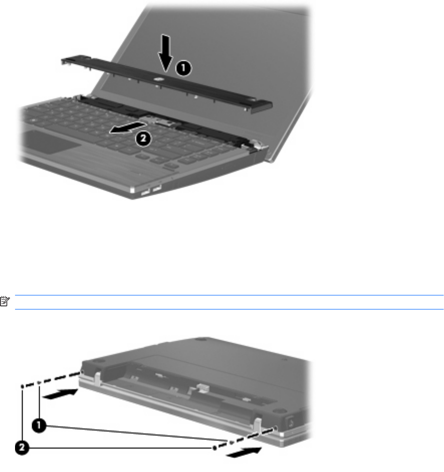 13. Helyezze vissza a 2 csavart (1) és a sapkájukat (2) a számítógép hátulján.