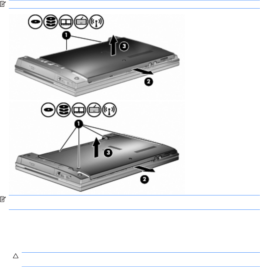 8. 底面カバーを前方向にスライドさせ(2)、持ち上げてコンピューターから取り外します(3)。