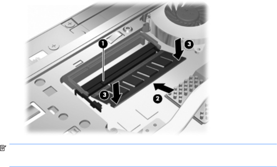 c. カチッと音がして留め具がメモリ モジュールを固定するまで、メモリ モジュールの左右の