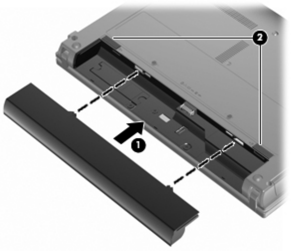 2. バッテリ ベイにバッテリを挿入し1、所定の位置に固定されるまで押し込みます。