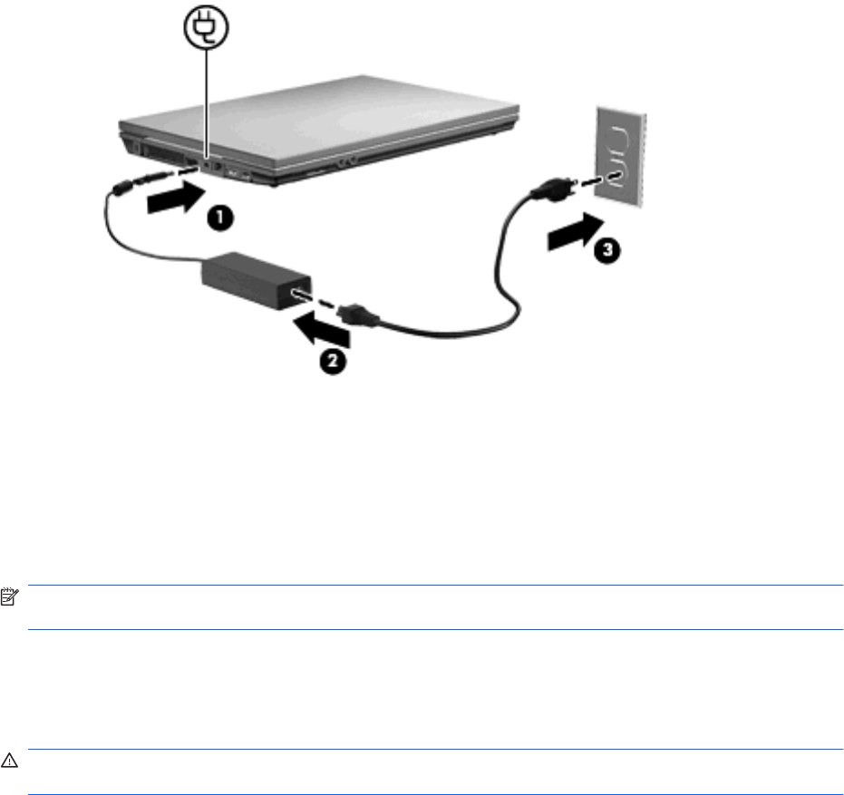 1. 将交流电源适配器插入笔记本计算机上的电源连接器 (1)。