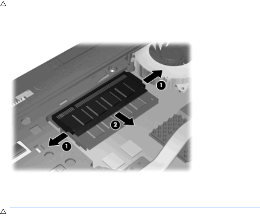b. 当内存模块与内存模块盒表面成 45 度角时,将内存模块 (2) 按入内存模块插槽直到其卡入