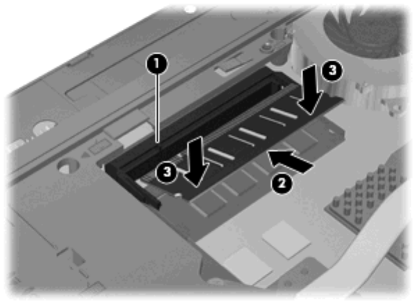c. 轻轻向下按内存模块 (3),对内存模块左右两边同时用力,直到固定夹卡入到位。