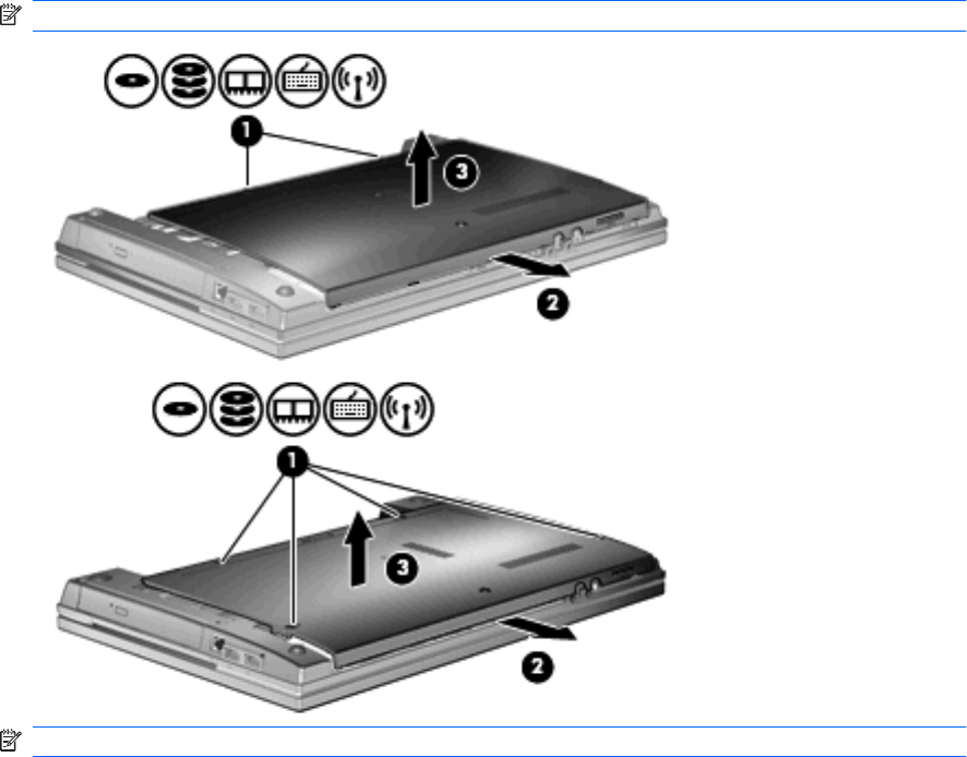 8. 将底盖向前滑动 (2),然后将其提起以脱离笔记本计算机 (3)。