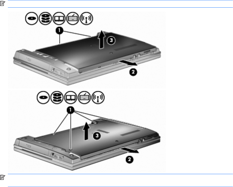 8. Deslize a porta inferior para frente (2) e, em seguida, suspenda-a (3) para fora do computador.