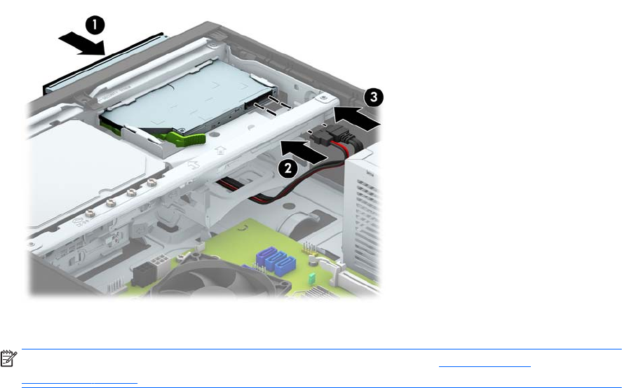 9. Iebīdiet optisko diskdzini caur korpusa priekšpusi līdz galam nodalījumā tā, lai tas fiksējas vietā (1), un