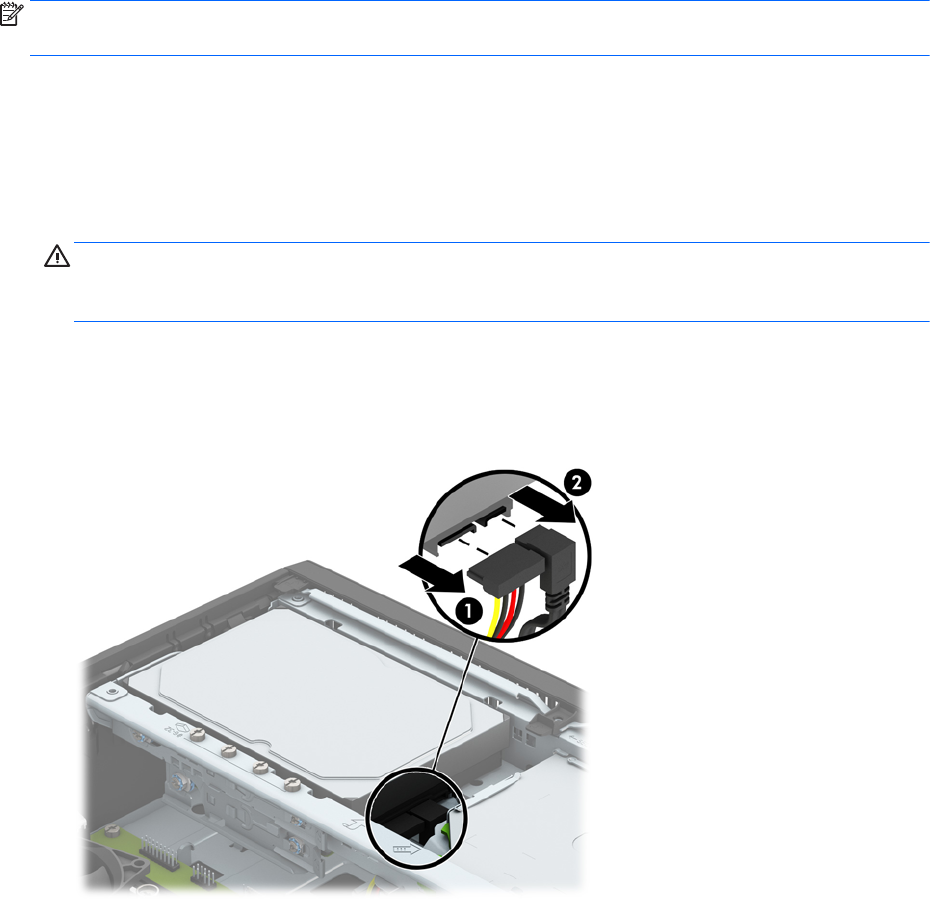 7. Atvienojiet strāvas kabeli (1) un datu kabeli (2) no cietā diska aizmugures.