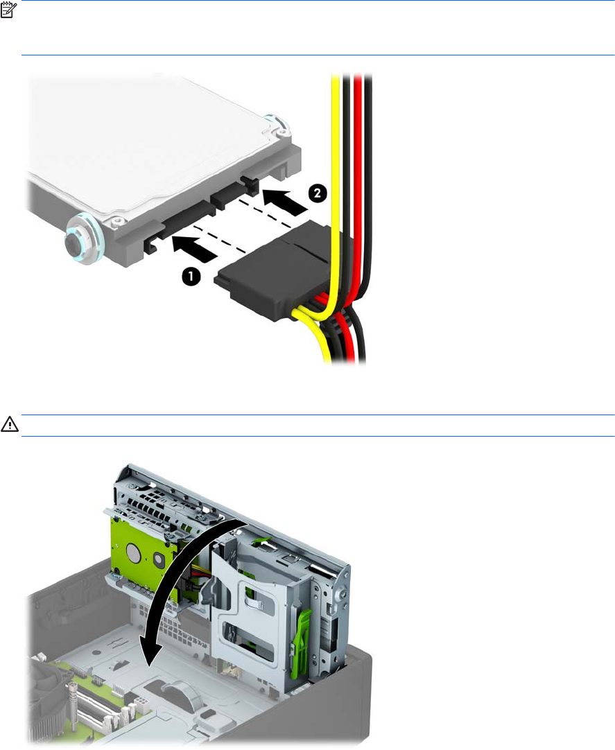 10. Pievienojiet strāvas (1) un datu kabeli (2) cietā diska aizmugurē.