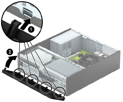 Вставьте четыре выступа в нижней части панели в прямоугольные отверстия корпуса (1), затем