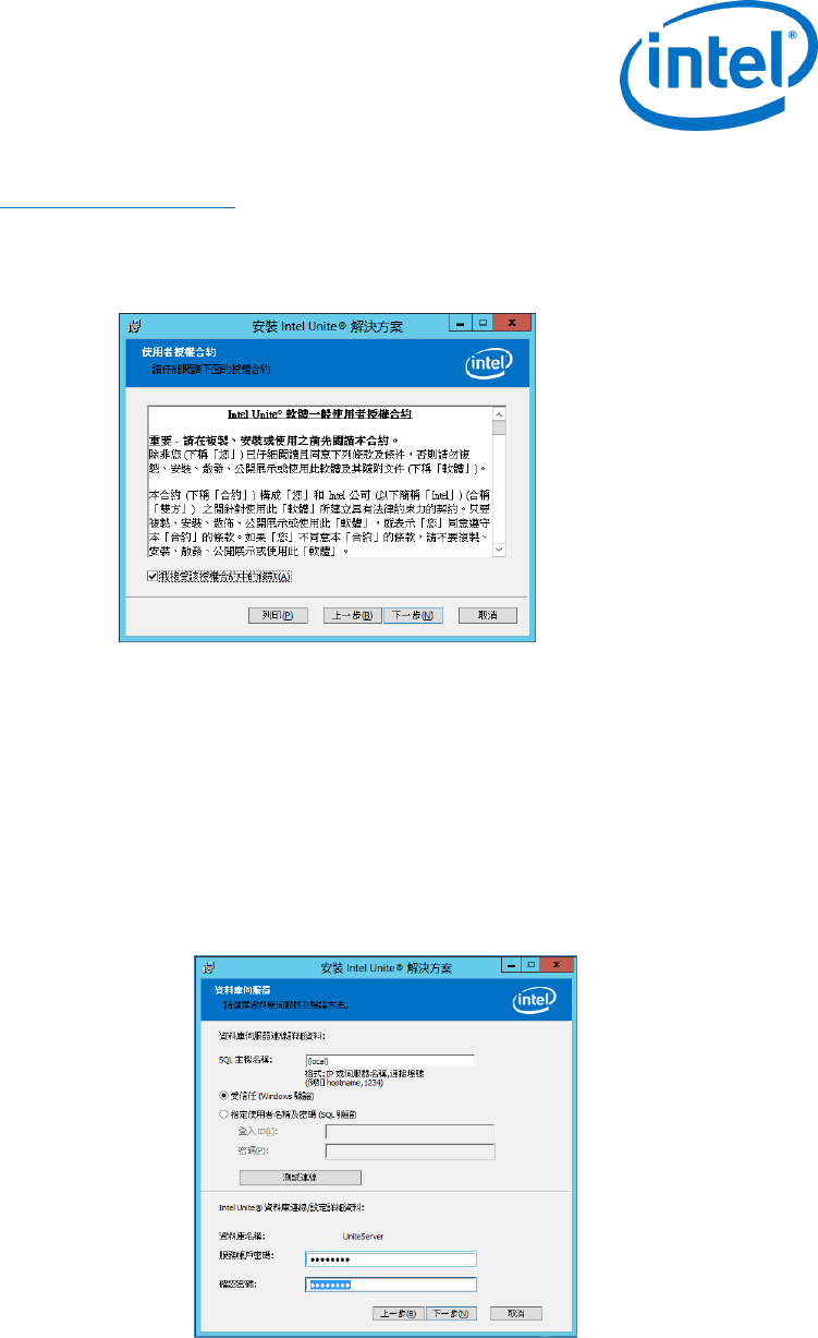確認執行前一節 (企業伺服器安裝前準備事項) 的所有步驟後,請繼續執行 Intel Unite 軟體安裝程式 (此程序需