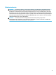 Sikkerhetsadvarsler ADVARSEL: For å redusere risikoen for varmerelatert skade eller overoppheting av datamaskinen må du ikke ha datamaskinen i fanget eller dekke til datamaskinens luftespalter. Plasser datamaskinen på en fast, plan flate når du skal bruke den. Pass på at ikke harde gjenstander, som f.eks. en tilkoblet skriver, eller myke gjenstander, som f.eks. puter eller tepper, blokkerer for luftstrømmen.