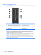 Dijelovi s prednje strane Konfiguracija pogona može se razlikovati ovisno o modelu. Neki modeli imaju masku okvira koja prekriva jedno ili više ležišta pogona. 1 Svjetlosni pokazivač aktivnosti tvrdog diska 6 Gumb za napajanje s dva stanja 2 Ležište za dvostruko niži unutarnji pogon od 5,25 inča (iza okvira) 7 Tanki optički pogon (dodatno) 3 Čitač SD kartica (neobavezno) 8 USB 2.0 priključak (crni) za punjenje (pod naponom) 4 USB 2.0 ulaz (crni) 9 USB 3.