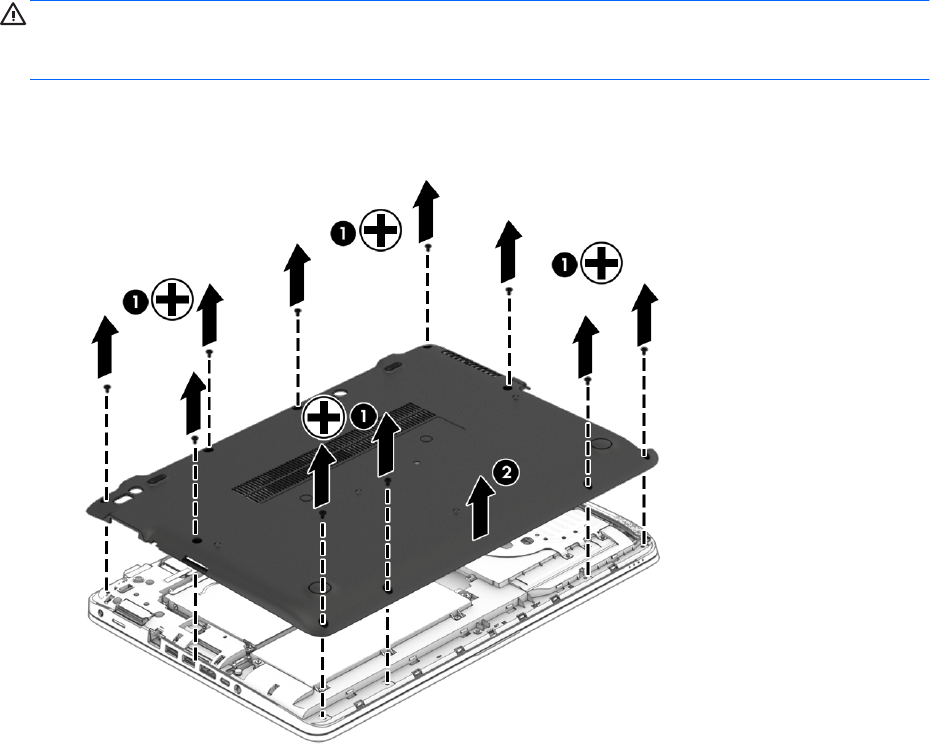 2. Rimuovere le 8 viti Phillips (1), quindi sollevare il coperchio (2) per rimuoverlo.