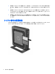 スタンドの取り付け 注意: Thin Client が HP クイック リリースに取り付けられている場合を除き、Thin Client の周囲の 適切な通気を確保するために、Thin Client はスタンドを取り付けた状態で操作する必要があります。 スタンドの調整 スタンドは 2 つの形に調整できます。横置き用の正方形と縦置き用の長方形です。 両側に取り付けられている 2 つの小さな部品を取り外して、スタンドを分解します。正方形にするに は、スタンドの両側をこの小さい部品の両端に近い接続ポイントにはめ込み、長方形にするには、中 央に近い接続ポイントにはめ込みます。 スタンドの取り付け 7