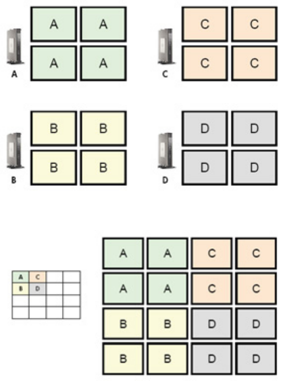 以下に示すように、それぞれに 4 台のモニターが 2×2 の配列で構成されている 4 台のクライアントが