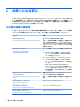 重要:一時ファイルをキャッシュするソフトウェア プログラムの場合は、Z ドライブにキャッシュし て C ドライブへの書き込み操作の量を減らすようにこれらのプログラムを構成することをおすすめ します。Z ドライブには、初期設定で以下の項目が格納されます。 ● 一時ユーザー ファイル、システム ファイル、および印刷スプール ファイル ● インターネット一時ファイル(表示の高速化のために保存される Web サイトおよびメディアの コピー) ● Web サイトの Cookie、キャッシュ、およびデータベース (設定を保存したり Web サイトのパ フォーマンスを向上させるために Web サイトによって保存される) ● ブラウザーの履歴 Z ドライブのサイズの設定について詳しくは、15 ページの HP Ramdisk Manager を参照してくださ い。 4 第 2 章 お使いになる前に