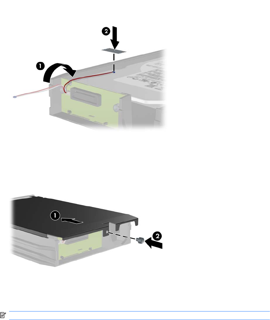 9. Glisaţi capacul pe suport (1) şi înlocuiţi şurubul din spatele suportului, pentru a-l fixa pe poziţie (2).