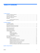 Table of contents 1 Product Features Standard Configuration Features ......................................................................................................... 1 Front Panel Components ..................................................................................................................... 2 Media Card Reader Components ......................................................................................................... 3 Rear Panel Components ................................