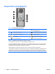 Frontpanelkomponenter Stasjonskonfigurasjonen kan variere med modell. Tabell 1-1 Frontpanelkomponenter 1 5,25-tommers optiske stasjoner1 6 Utløserknapp for optisk stasjon 2 Aktivitetslys på optisk enhet 7 3,5-tommers minnekortleser (tilleggsutstyr)2 3 Aktivitetslys for harddisk 8 Strømbryter med dobbelt funksjon 4 Mikrofon-/hodetelefonkontakt 9 Strøm på-lampe 5 USB 2.