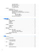 索引 符号/编号 1394 电缆,连接 76 1394 端口 8, 75 1394 设备 连接 75 取出 76 A Altiris 部署解决方案 119 安全保护 保护笔记本计算机 97 无线 16 安全保护菜单 Disk Sanitizer 127 HP Sparekey 126 HP SpareKey 注册 127 更改密码 127 密码策略 126 驱动器锁 127 设置 BIOS 管理员密码 126 始终提示 HP SpareKey 注 册 126 系统标识 127 用户管理 126 指纹识别器重置 127 自动驱动器锁 127 安全保护缆锁槽口 8 按键 esc 6 fn 6 Windows 徽标 6 Windows 应用程序 6 功能 6 小键盘 6 按钮 QuickLook 4 QuickWeb 4 触摸板 1 触摸板开关 2, 5 电源 4 键盘 12 降低音量 35 静音 5, 35 无线 5 134 索引 显示屏释放 7 增大音量 5, 35 指点杆 1 B BIOS 更新 安装 113 下载 113 BIOS 管理员密码 126 Bluetooth 标签 13 备份和还原中心 13