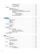索引 符号/编号 1394 电缆,连接 75 1394 端口 8, 74 1394 设备 连接 74 取出 75 A Altiris 部署解决方案 118 安全保护 保护笔记本计算机 96 无线 16 安全保护菜单 Disk Sanitizer 126 HP Sparekey 125 HP SpareKey 注册 126 更改密码 126 密码策略 125 驱动器锁 126 设置 BIOS 管理员密码 125 始终提示 HP SpareKey 注 册 125 系统标识 126 用户管理 125 指纹识别器重置 126 自动驱动器锁 126 安全保护缆锁槽口 8 按键 esc 6 fn 6 Windows 徽标 6 Windows 应用程序 6 功能 6 小键盘 6 按钮 QuickLook 4 QuickWeb 4 触摸板 1 触摸板开关 1, 5 电源 4 键盘 12 降低音量 5, 35 静音 5, 35 无线 5 显示屏释放 7 增大音量 5, 35 指点杆 1 B BIOS 更新 安装 112 下载 112 BIOS 管理员密码 125 Bluetooth 标签 13 备份文件和文件夹 129 标签