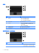 1 功能 识别硬件 随计算机附带的组件可能会因地区和型号而异。本章中的插图标识了大多数笔记本计算机机型上的标准 功能。 ▲ 要查看笔记本计算机中安装的硬件的列表,请选择 Computer(计算机) > Control Center(控制 中心) > YaST > Hardware Information(硬件信息)。 顶部组件 触摸板 组件 说明 (1) 触摸板 移动指针,选择或激活屏幕上的项。 (2) 左侧触摸板控件 功能类似于外接鼠标的左键。 (3) 触摸板滚动区 向上或向下滚动。 (4) 右侧触摸板控件 功能类似于外接鼠标的右键。 识别硬件 1