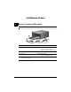 Installazione di base 1 Estrarre il contenuto della scatola ✎ Il colore, le funzioni e le opzioni del computer possono variare. Componente Componente 1 Computer 4 Adattatore per cavo modem specifico del Paese o della regione (solo in determinati modelli) 2 Adattatore CA 5 Cavo di alimentazione 3 Batteria 6 Cavo modem (solo in determinati modelli) ✎ L’aspetto di cavi modem, batterie e cavi di alimentazione varia in base al Paese o alla regione.