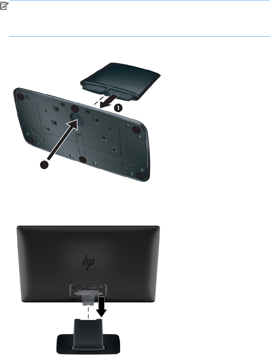 2. Deslice el pedestal en la ranura de la base (1) hasta que el pedestal haga clic en la base.